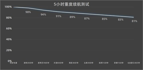 经过中关村在线五小时重度续航测试,iQOONeo11还能剩余81%的电量,就算周末假期猛猛上分也不用担心电量问题。